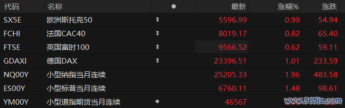 周四盘前,美股三大股指期货齐涨,欧洲主要指数普遍上涨。截至发稿,纳斯达克100指数期货涨1.96%,标普500指数期货涨1.48%,道指期货涨0.78%。